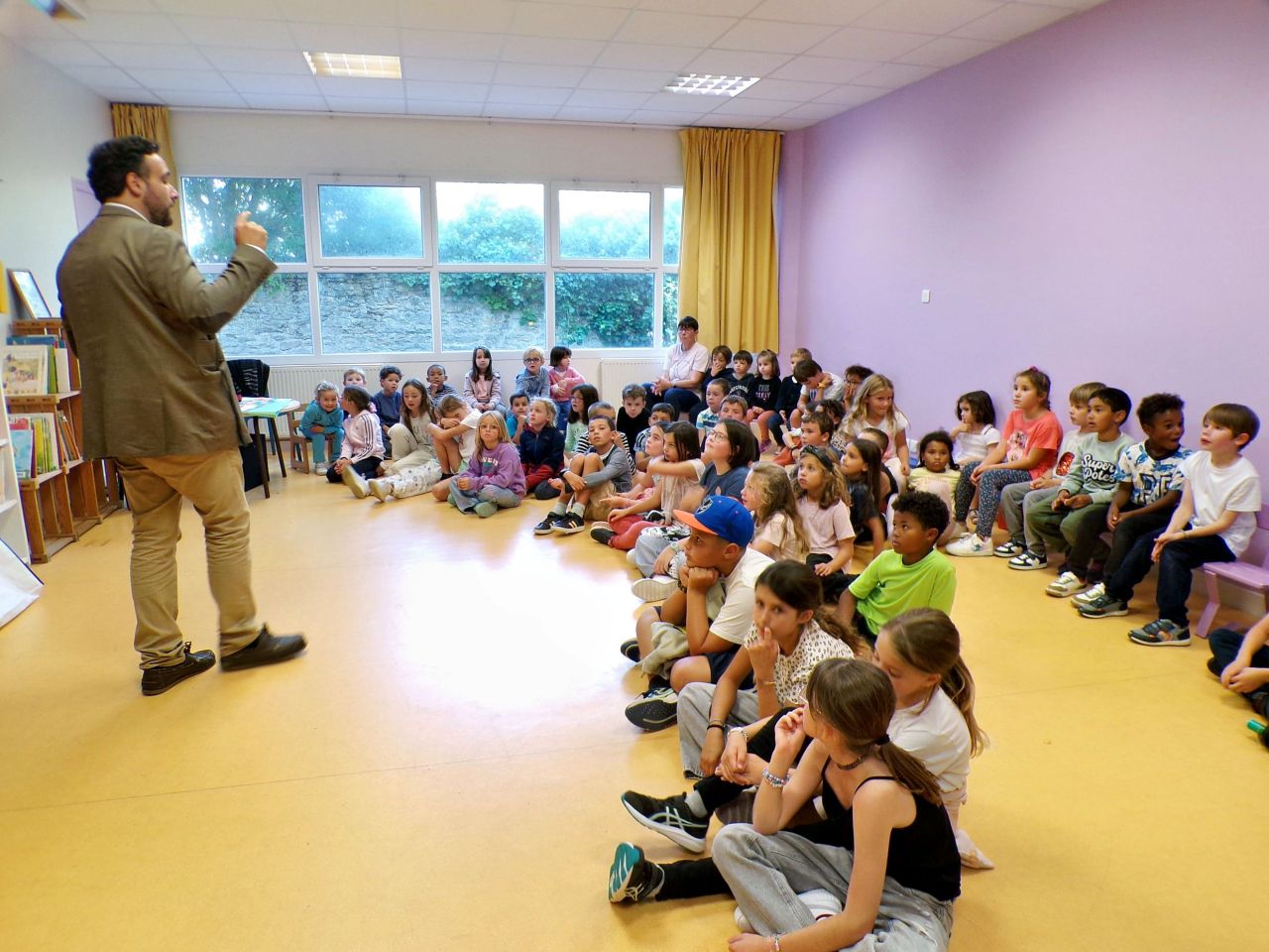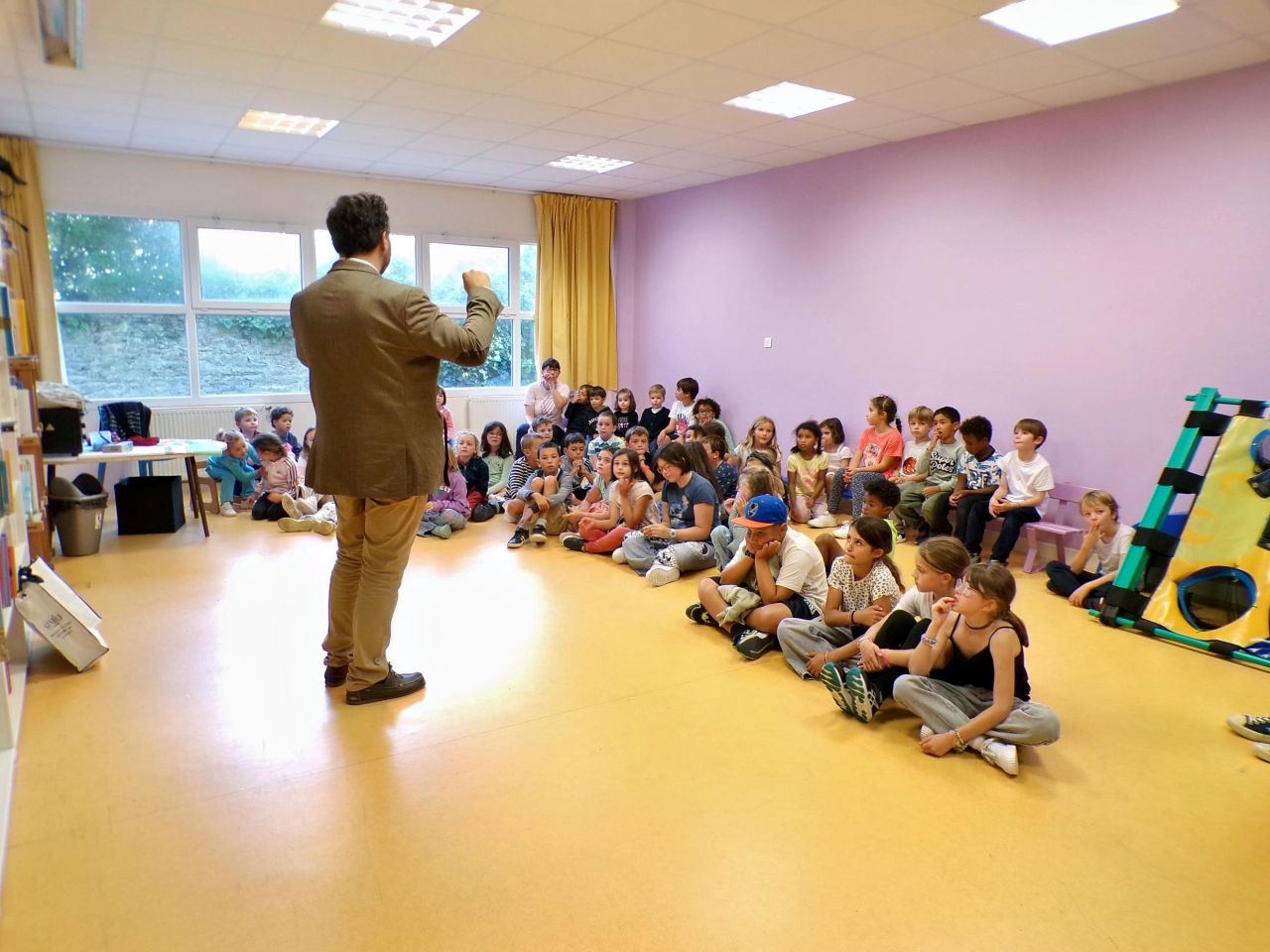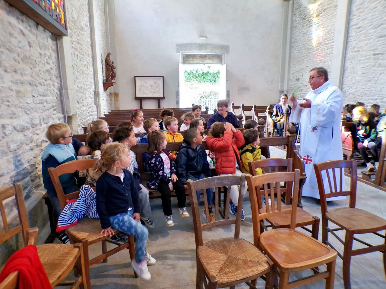 Le père Marius est venu à l'école pour bénir les enfants et les cartables.